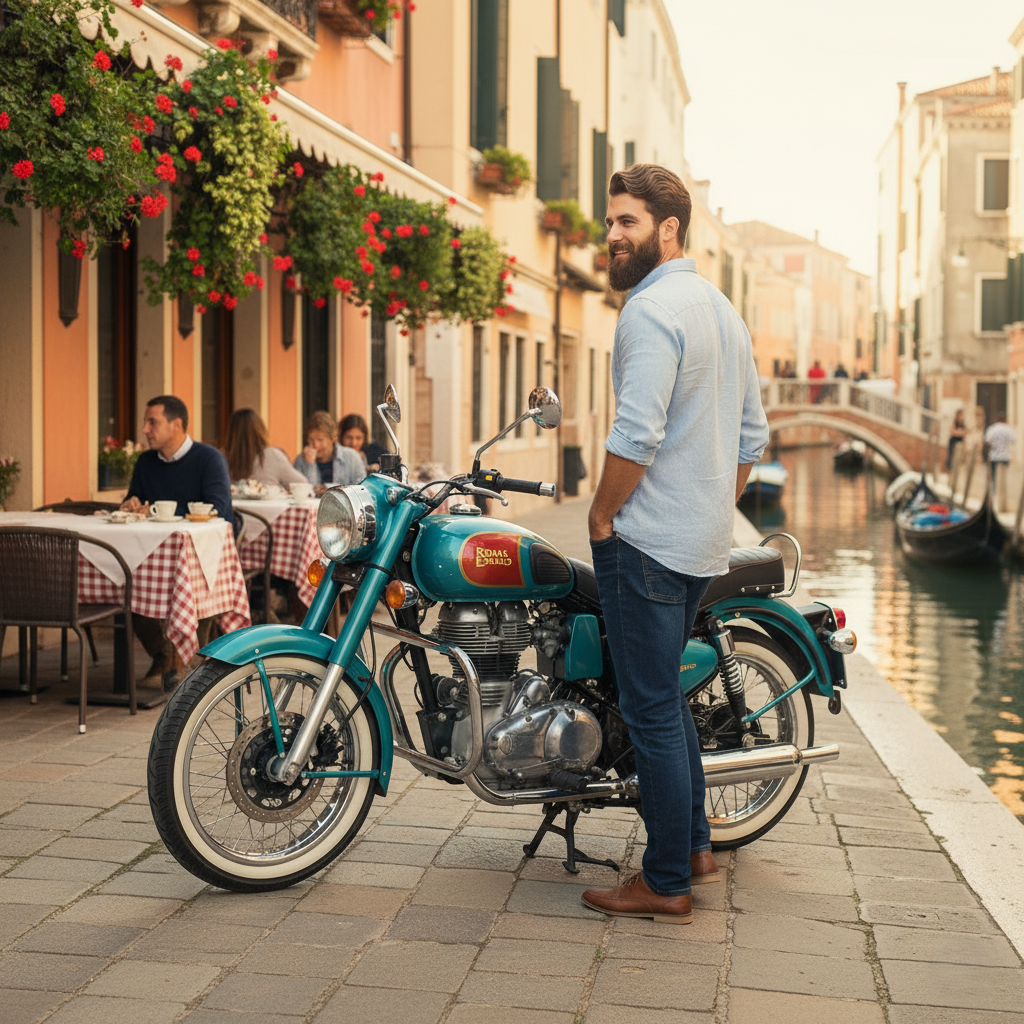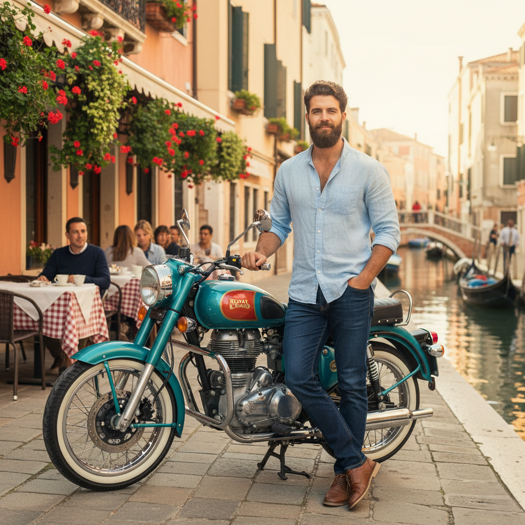 Capture the relaxed charm of Venice with this AI photography prompt featuring a young man parking his Royal Enfield Goan Classic 350 near a cozy Venetian café. Morning sunlight, pastel buildings, and cobblestone streets set the scene for a cinematic, cosmopolitan travel portrait — perfect for lifestyle, adventure, and fashion-inspired AI creations.